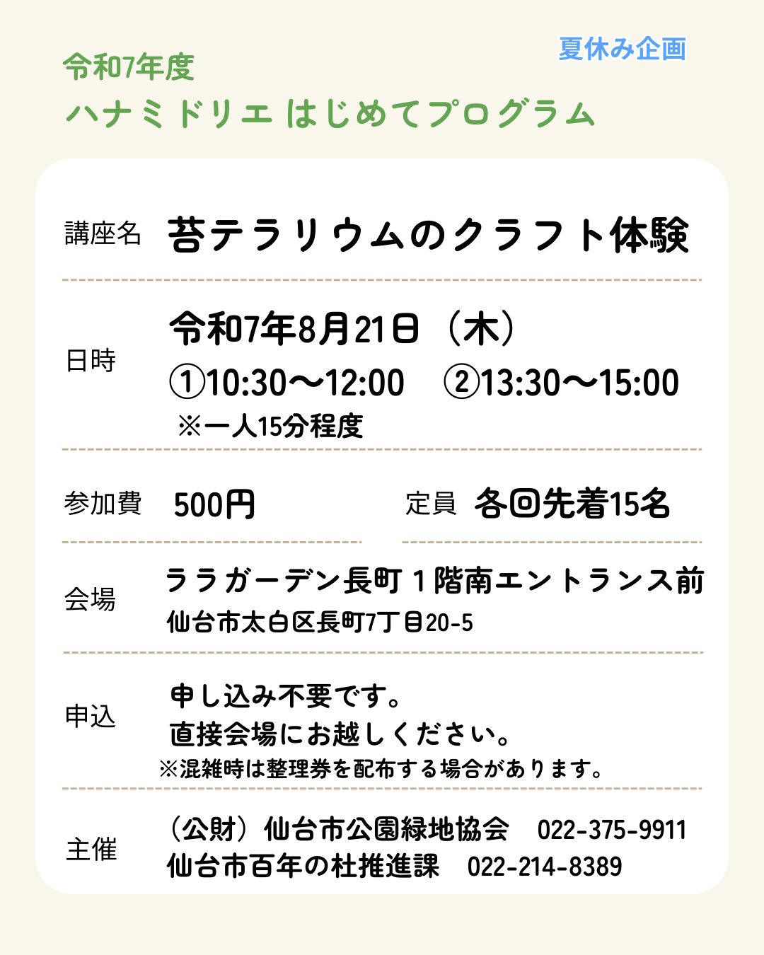 8月21日(木)に、初めてでも気軽に参加できる講座「ハナミドリエ・はじめてプログラム」夏休み企画として、「苔テラリウムのクラフト体験」を、太白区長町のララガーデン長町1階で開催します。