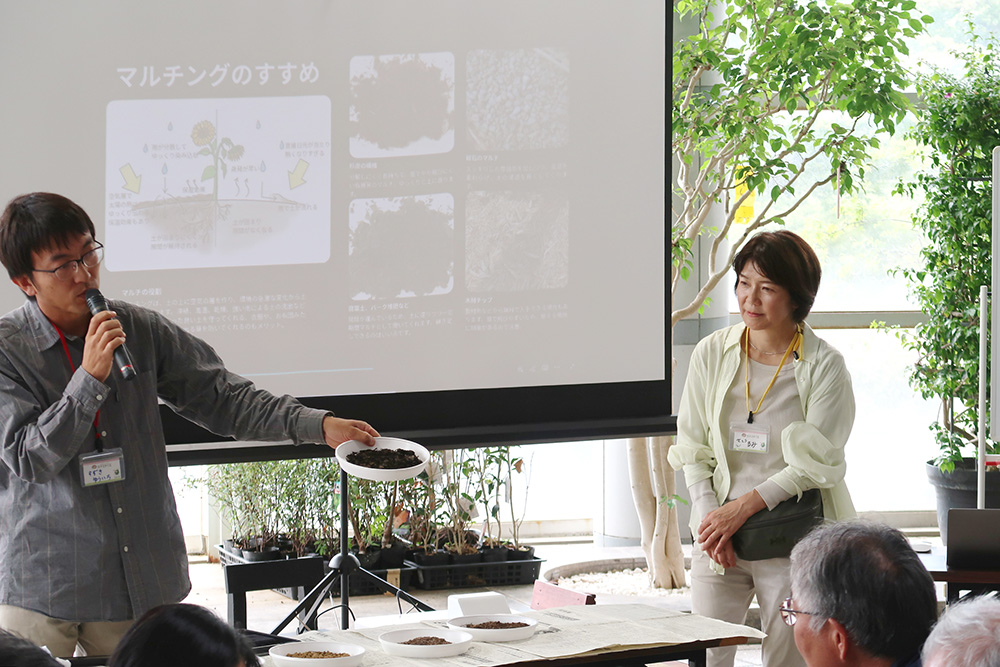講師の(株)泉緑化 鈴木悠一さんと松本明美さんのお二人に、「植物が育つ土づくり」と「植物の育ち方とデザイン」について、それぞれお話しいただきました。