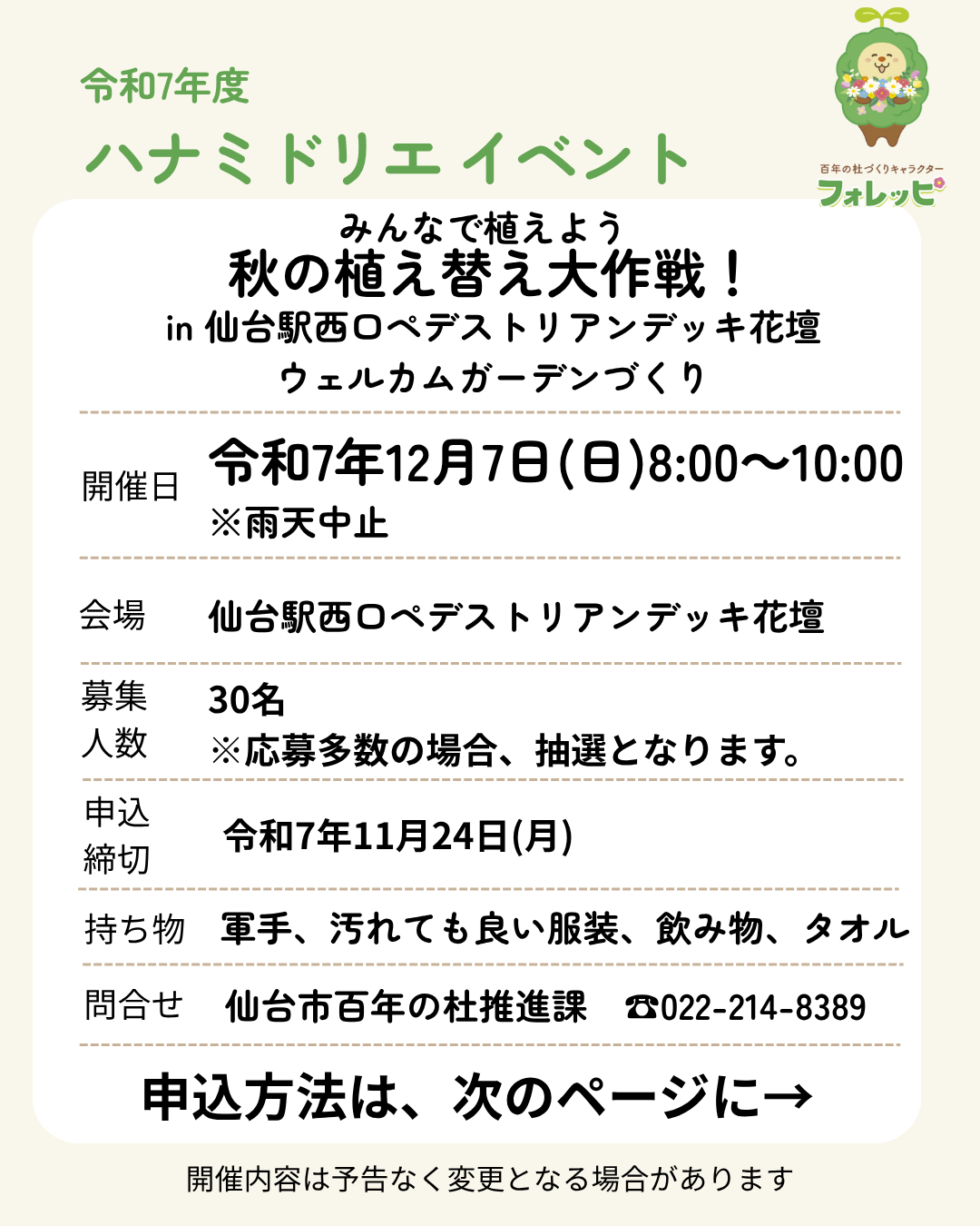 【参加者募集】12月7日(日)開催、秋の植え替え大作戦!「in 仙台駅西口ペデストリアンデッキ花壇ウェルカムガーデンづくり」