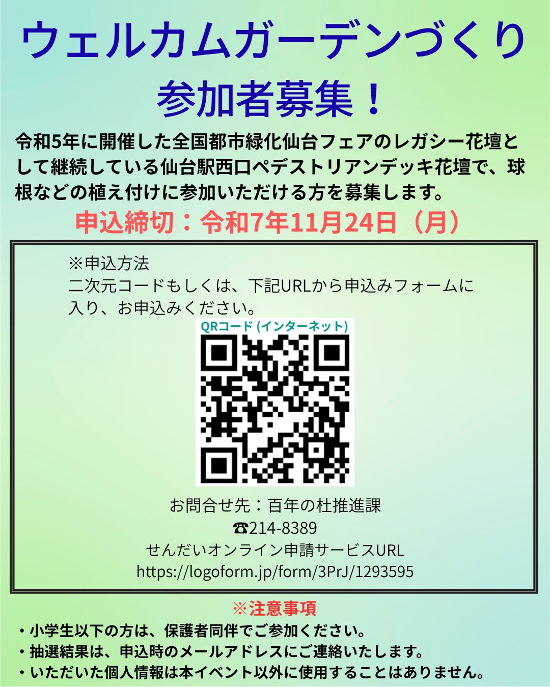 緑化フェアのレガシー花壇として継続している仙台駅西口ペデストリアンデッキ花壇を会場に、球根などを植える体験イベントを開催します。皆さんの参加をお待ちしています!