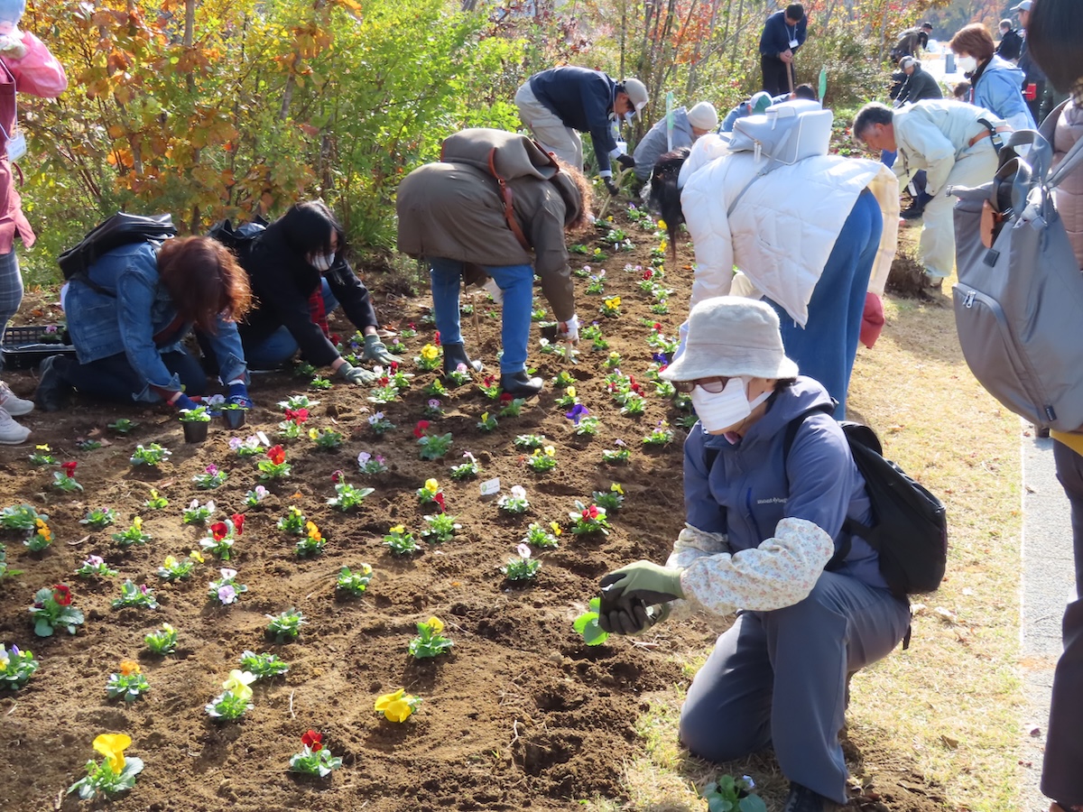 2025年11月16日(日)、青葉山公園追廻地区で「みんなで植えよう、秋の植え替え大作戦!」を開催しました。秋晴れの中、10者の企業・団体等の方や花壇づくり団体等の皆さんにお手伝いいただきながら、約70名の市民の方々にご参加いただき、プロムナード沿い花壇に秋冬の花苗としてパンジーとビオラを約1,000株植えました。