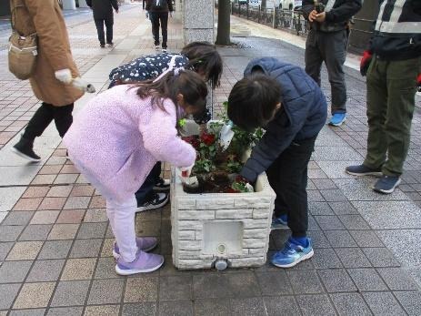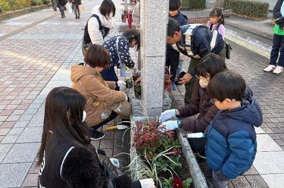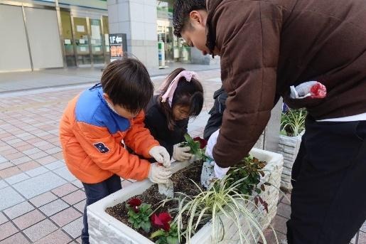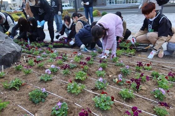 東北福祉大学仙台駅東口キャンパス前から榴岡公園まで続く62基のプランターと、榴岡公園南側エントランスのプランター10基、榴岡公園の花壇に、赤色のパンジーやビオラなど約1,000株を植えました。