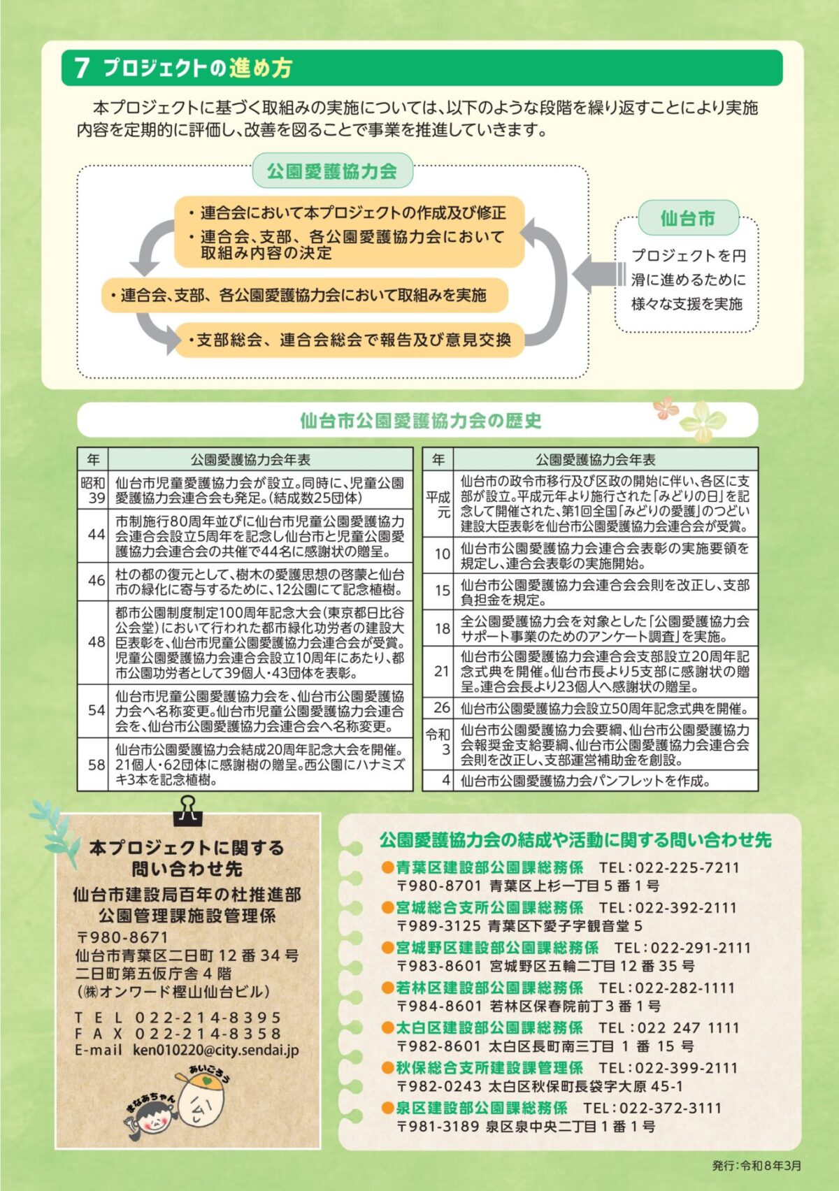 本プロジェクトは、仙台市公園愛護協力会連合会と仙台市が共同で策定しており、それぞれの活動主体が互いに連携しながら活動推進に向けた取組みを進めていきます。